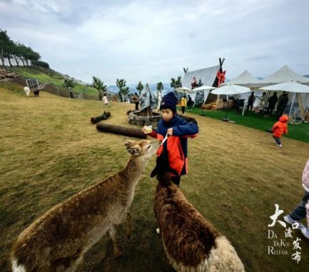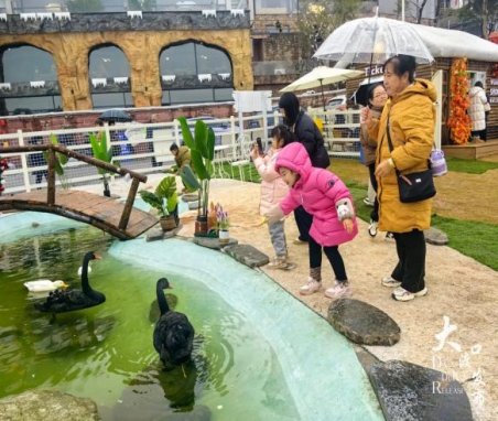 位于跳磴镇石盘村的长江石居凭借冬日特色活动吸引了大批游客。记者看到,庭院内,洁白的人造雪簌簌飘落,孩子们裹着厚厚的外套穿梭其间,追着雪花奔跑、玩耍,清脆的嬉笑打闹声传遍角落;牧场里,呆萌的羊驼摇头晃脑地踱步,黑天鹅悠闲地游过水面,游客们争相合影留念。