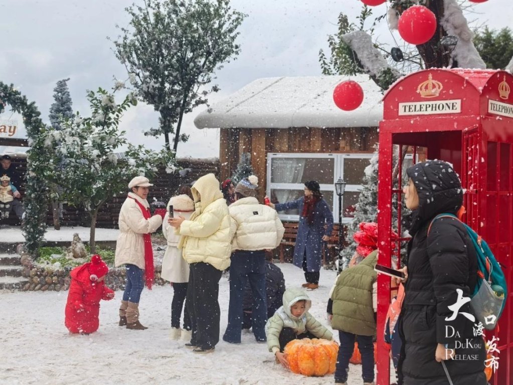 各景区、网红打卡点依旧人气不减。从乡野庭院的悠然,到梦幻城堡的浪漫,游客们或追着人造雪花肆意奔跑,或围坐茶台煮茶赏江景,或沉浸在篝火旁的歌声与欢笑里。这场浸润在雨丝中的假期盛宴,处处洋溢着独属于大渡口的烟火气与幸福感。