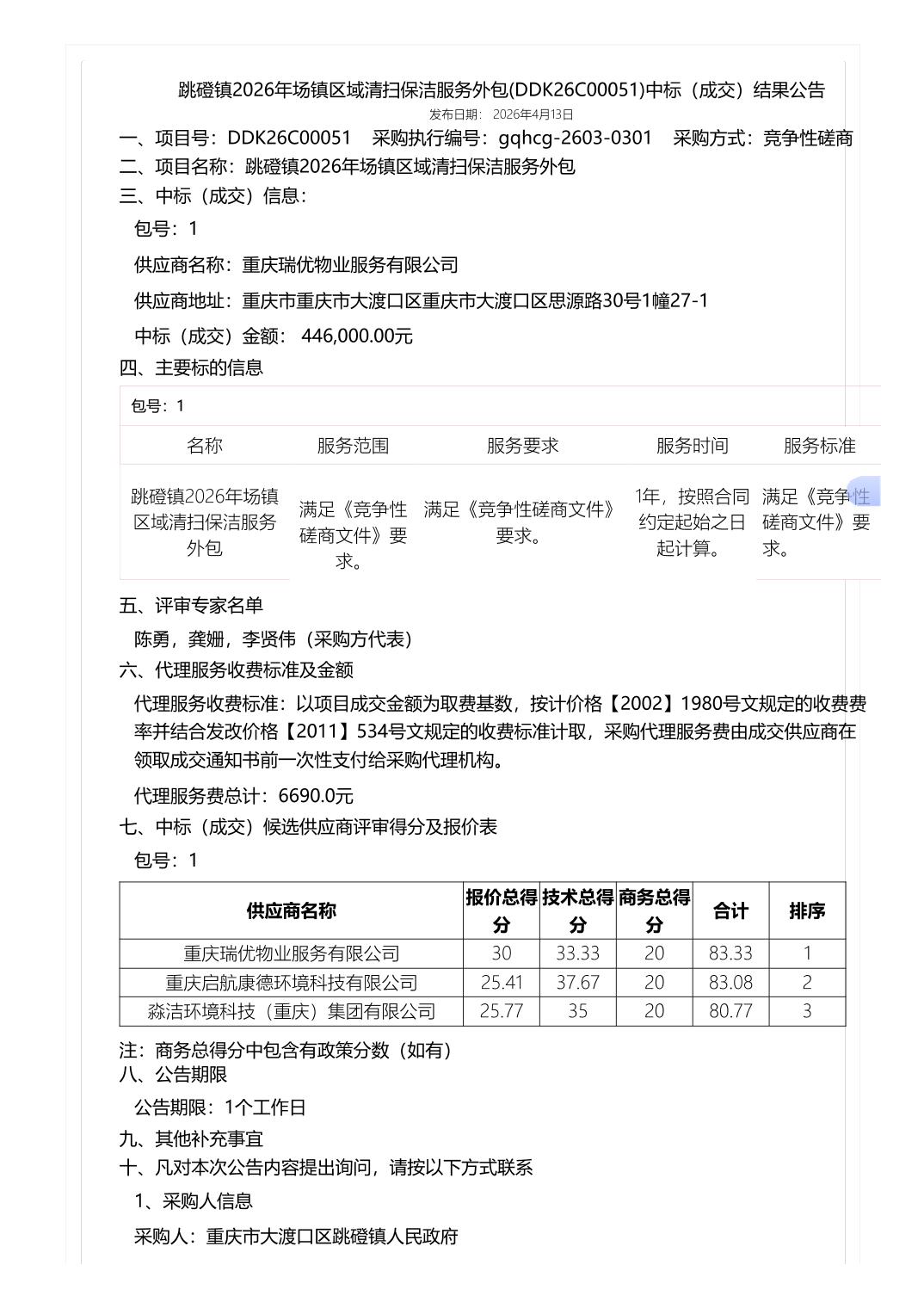 跳磴镇2026年场镇区域清扫保洁服务外包(DDK26C00051)中标(成交)结果公告